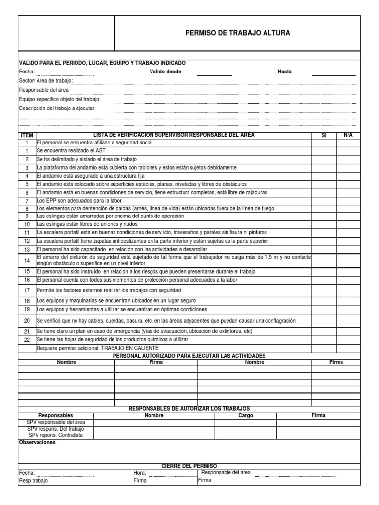 No trabajar a la intemperie en el caso de fuertes vientos y lluvia. El presente formato de Permiso de Trabajo representa una gua para la identificacin de peligros y riesgos del trabajo crtico a ejecutar dentro del rea concesionada. About Press Copyright Contact us Creators Advertise Developers Terms Privacy Policy.