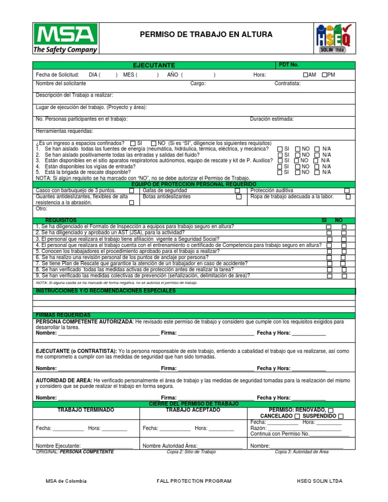 Certificacin que se obtiene mediante el certificado de capacitacin de trabajo seguro en alturas. Cdigo talento humano seguridad y salud ocupacional versin formato permiso trabajo en alturas pgina 1 de 2 permiso concedido fecha a los trabajadores nombre cargo. Solicitar la renovacin del permiso de trabajo en caso necesario.